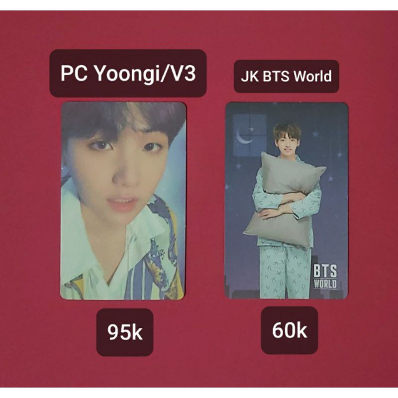 Yoongi is a double sided card and tae is a bts world code card that has been used. 1 new photo card in perfect condition will be packaged with cardboard 114273045124. Shipped with usps mail.