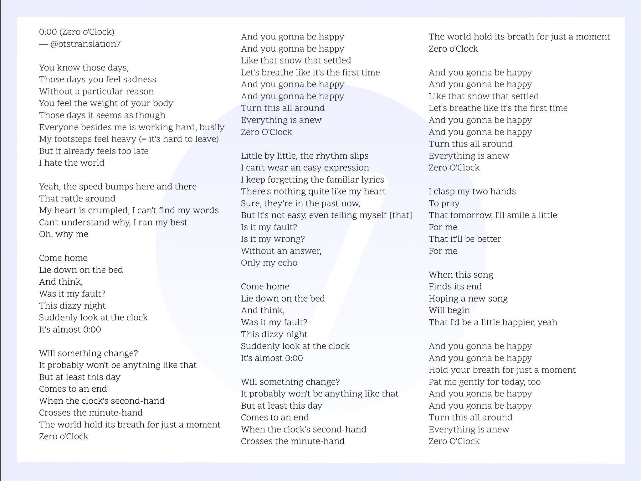 0000 zero oclock is a song by jungkook jimin jin and v also known as the vocal line of bts. Bts 0000 zero oclock june 2020. It was released on february 21 2020 and appears as the thirteenth track in their fourth studio album map of the soul.